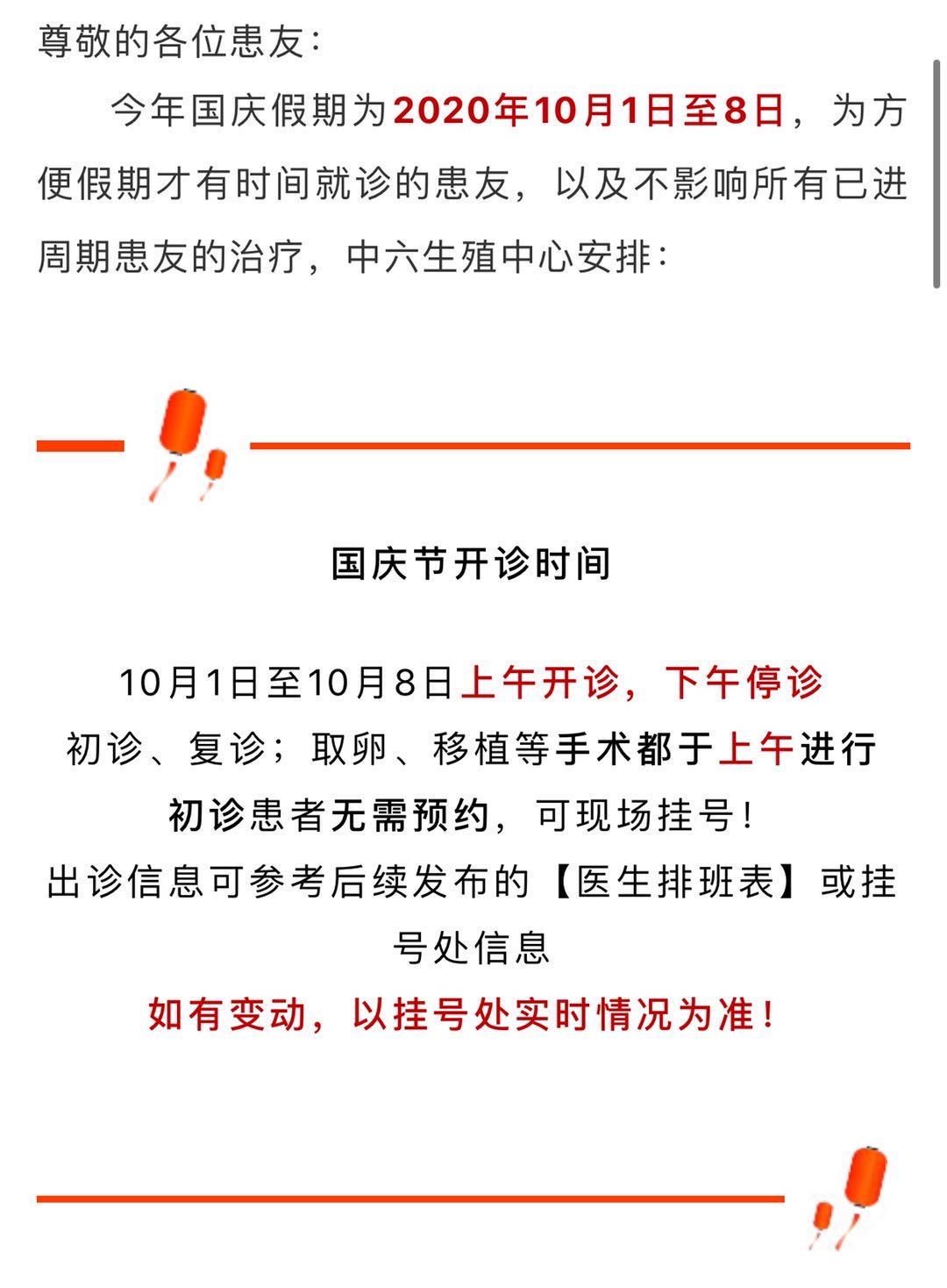 中六生殖中心365日无休门诊!中秋国庆长假,我们也为您开诊哦!