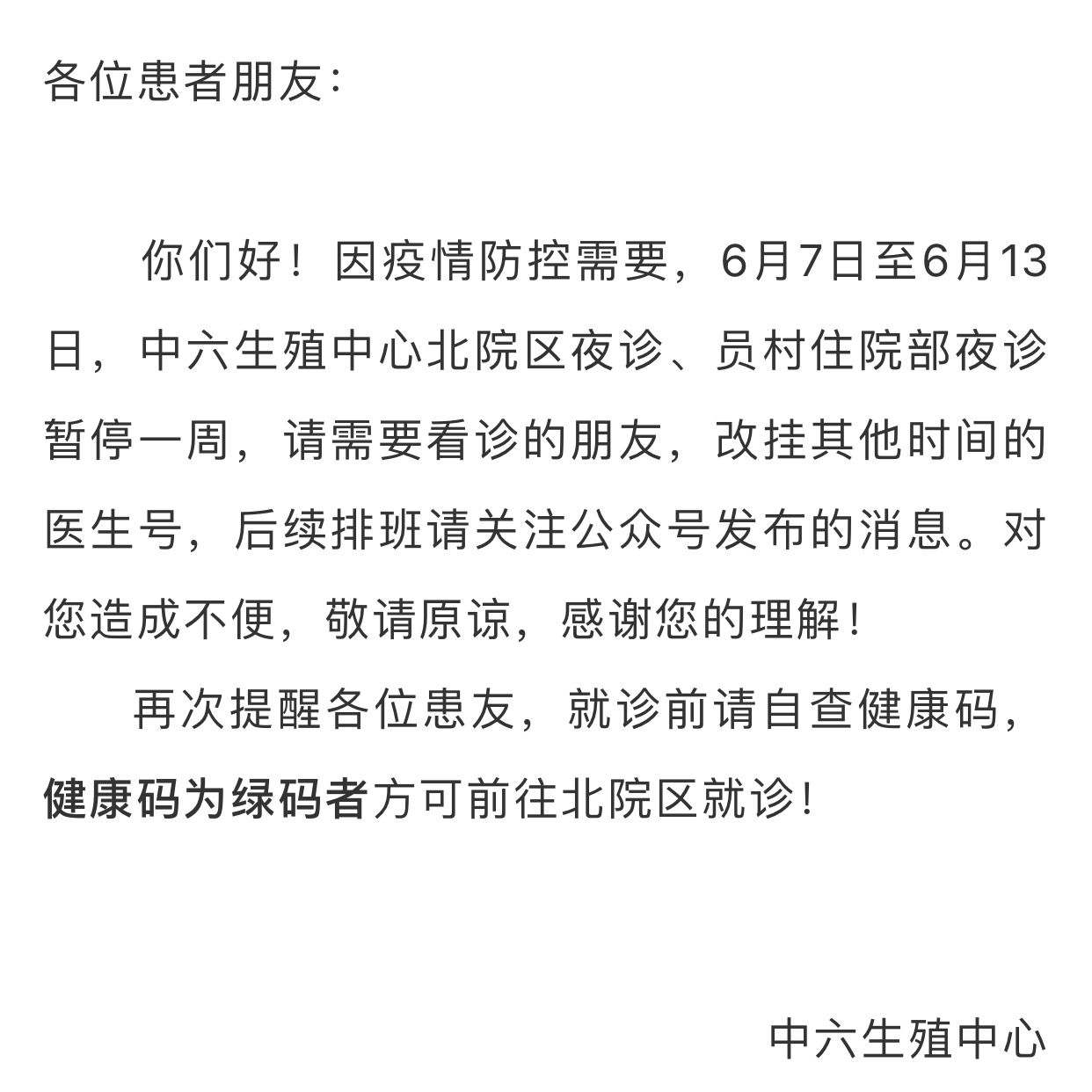 停诊通知:6月7日起,中六生殖中心北院区&员村夜诊暂停一周