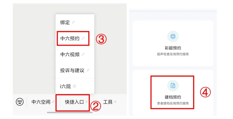 方法2:搜索并关注“中六生殖”微信服务号,点击快捷入口选择中六预约,然后选择建档预约: