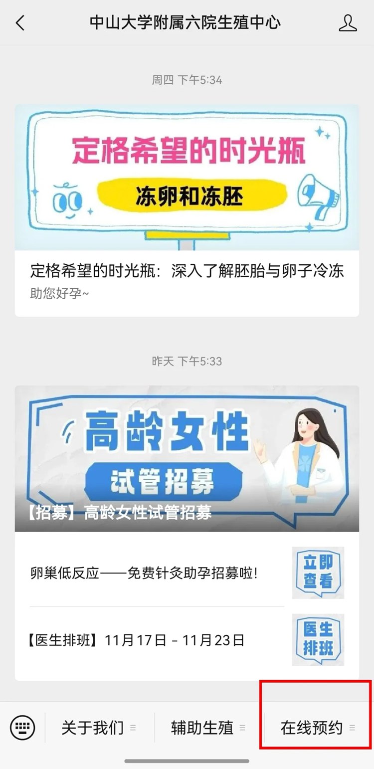 方法3:搜索并关注“中山大学附属六院生殖中心”微信公众号,点击在线预约,选择对应预约项目即可跳转预约界面:
