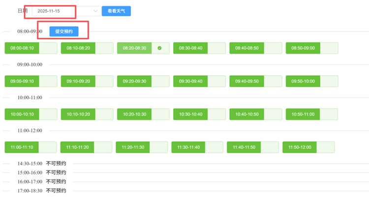 3.选择预约日期及时间段,点击提交预约即可: